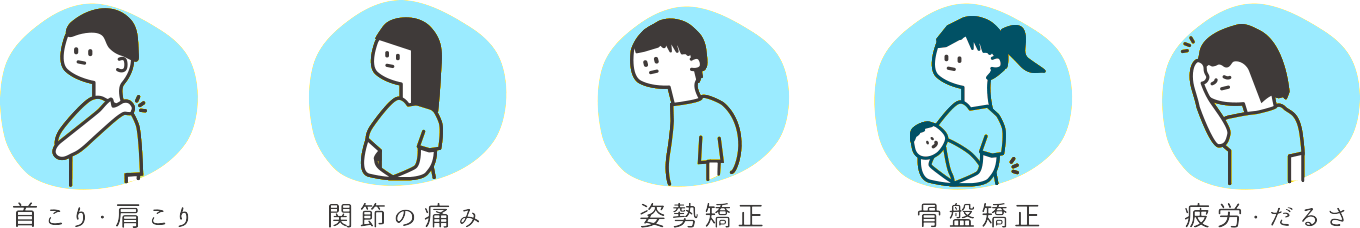交通事故後の不調や痛み、長年の肩こりや腰痛、スポーツでの捻挫や骨折、女性特有の出産後の悩みや冷え性・むくみなど、どんなに小さいことでもかまいません。