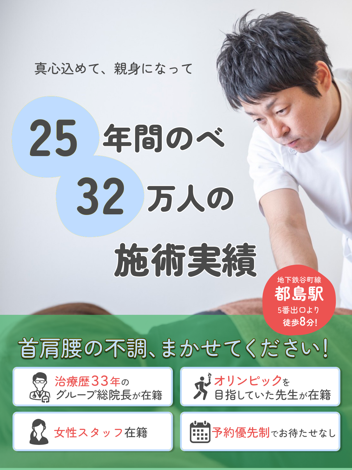 無駄な通院が一切ありません初回検査の段階で、症状が改善するまでのおおよその通院回数がわかります。根本の原因を的確に把握し、多くの施術経験と照らし合わせ計画を立てますので、大きくずれるようなことがありません。忙しい方にとっても安心して施術を受けていただくことができます。